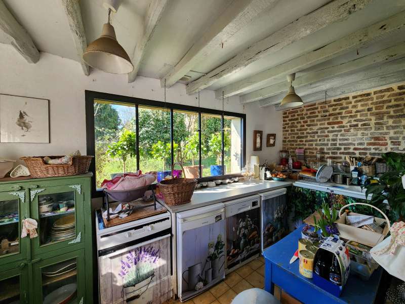 Ravissante maison de campagne comprenant : pièce de vie avec poêle à bois (colombages), cuisine semi-ouverte, une chambre, dégagement, salle d'eau, wc. Etage : une pièce palière desservant deux chambres. Superbe terrain clos arboré (verger) sur une parcelle de 1021m² avec une terrasse au sud, une grange et une agréable pergola. Beaucoup de charme pour cette maison nichée au coeur d'un environnement valonné et verdoyant.
