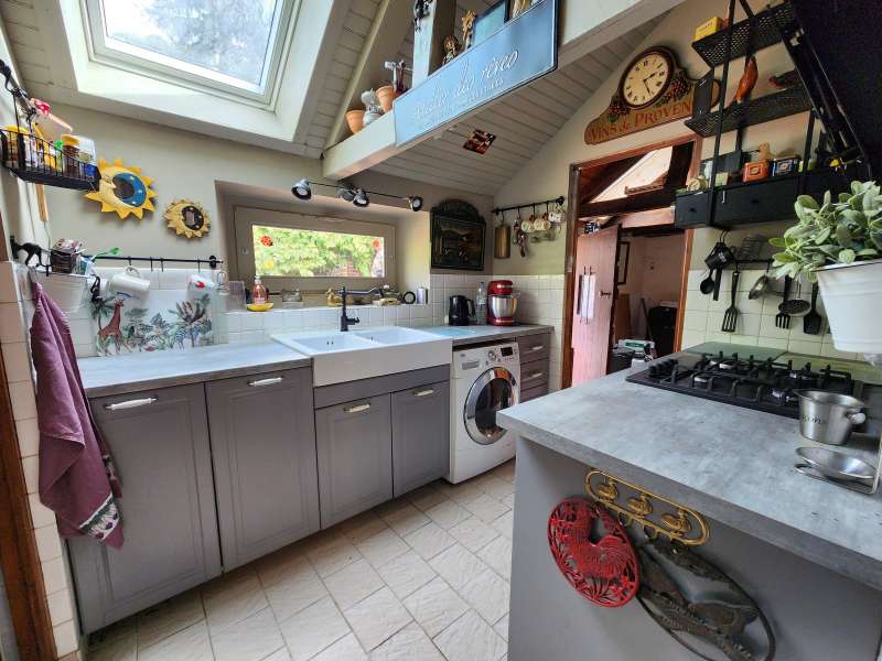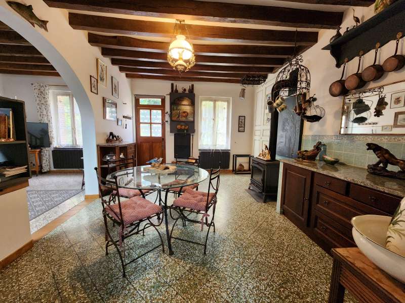 Maison de village mitoyenne d'un côté, comprenant : entrée sur salon/salle à manger avec poêle à bois, cuisine aménagée, salle d'eau avec wc, cellier, cave. Etage : une grande chambre en mezzanine. Grange en retour avec atelier, terrasse sur l'arrière et jardin clos arboré avec puits sur une parcelle de 851m². Du charme, au calme, au coeur d'un charmant village du Perche.