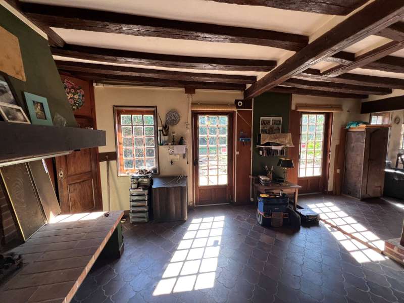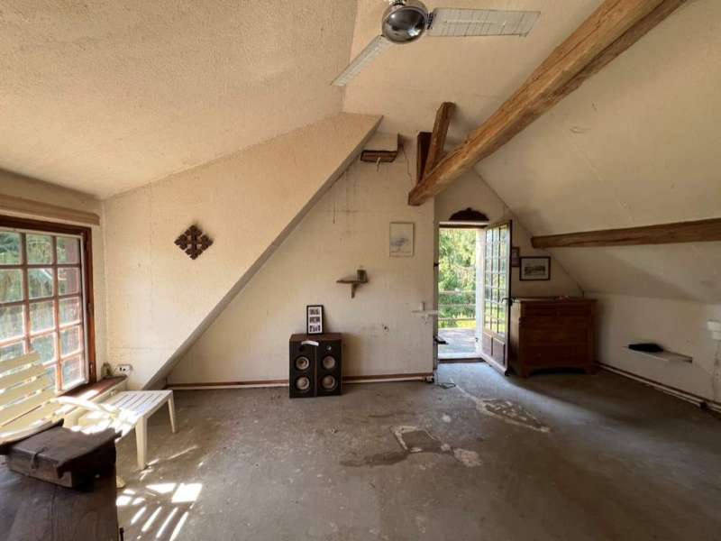 Maison de campagne en colombages comprenant : une pièce de vie avec cheminée foyer ouvert, une salle à manger ouverte sur une cuisine et un petit salon verré, une chambre avec mezzanine, une salle de bains, une salle d'eau, wc. Etage : un palier desservant deux chambres dont une avec balcon; Dépendance dans superbe parc arboré tout autour sur une parcelle de 1865m². Beaucoup de charme et d'authenticité pour cette maison nichée dans la nature. Beaucoup de potentiel.